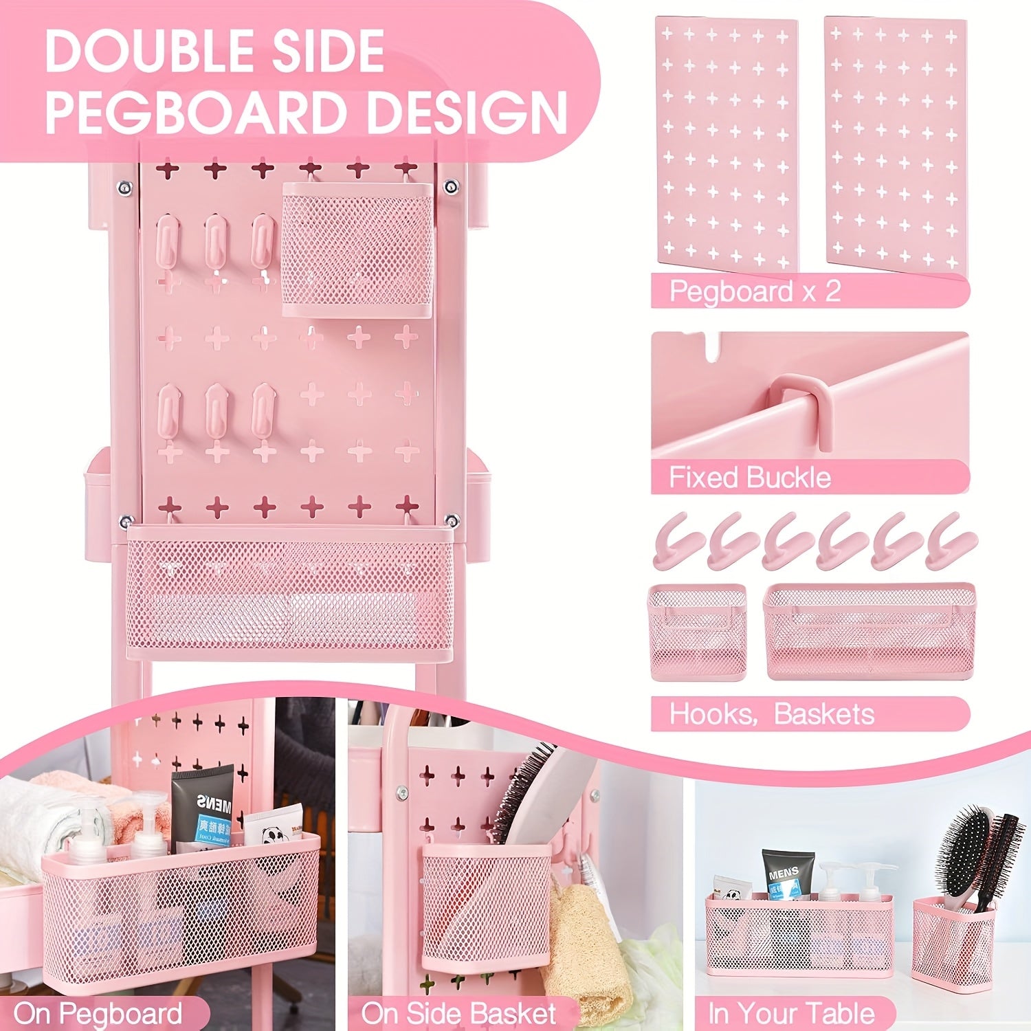 [Special DIY Pegboard]This 3 tier rolling cart features 2 metal DIY pegboard that can be positioned on the front side according to your preference. You can also freely add hooks to the pegboard for storage. Additionally, the rolling cart comes with two hanging baskets and four hooks, significantly enhancing storage space and catering to your DIY needs.